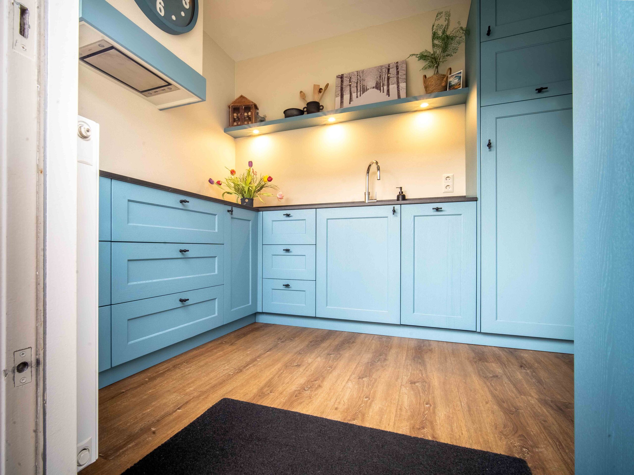 De keuken is op maat gemaakt, wat zorgt voor unieke details en een perfecte afstemming op de wensen van de klant. Zo heeft de klant bijvoorbeeld gekozen voor een 45 cm. vaatwasser, omdat zij met een klein huishouden zijn. In de hoek is een ‘Le Mans systeem’ gebruikt, dit is een geweldige keuze om de ruimte in de hoeken van de keuken optimaal te benutten! Dit draaimechanisme maakt het mogelijk om kasten in de hoeken volledig uit te trekken, zodat je gemakkelijker bij de achterste delen van de kast kunt. Het voorkomt dat je waardevolle opbergruimte achterin de kast moeilijk bereikbaar blijft.
